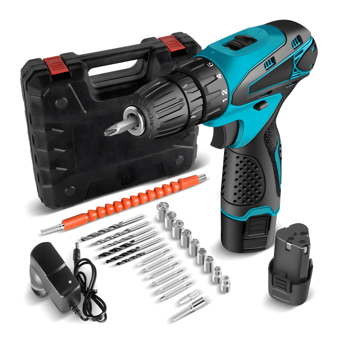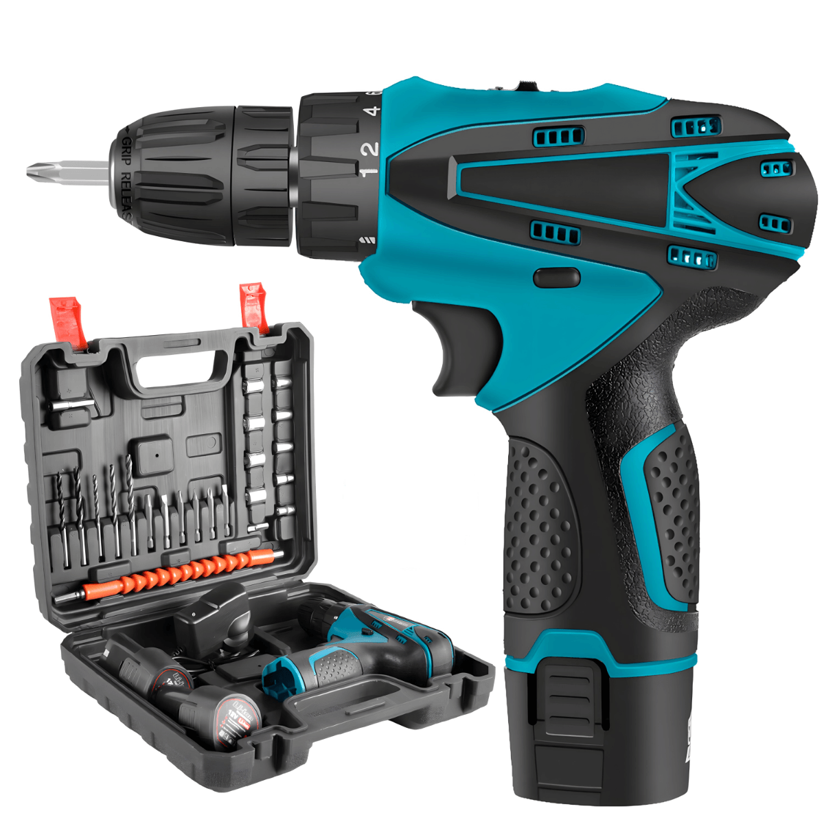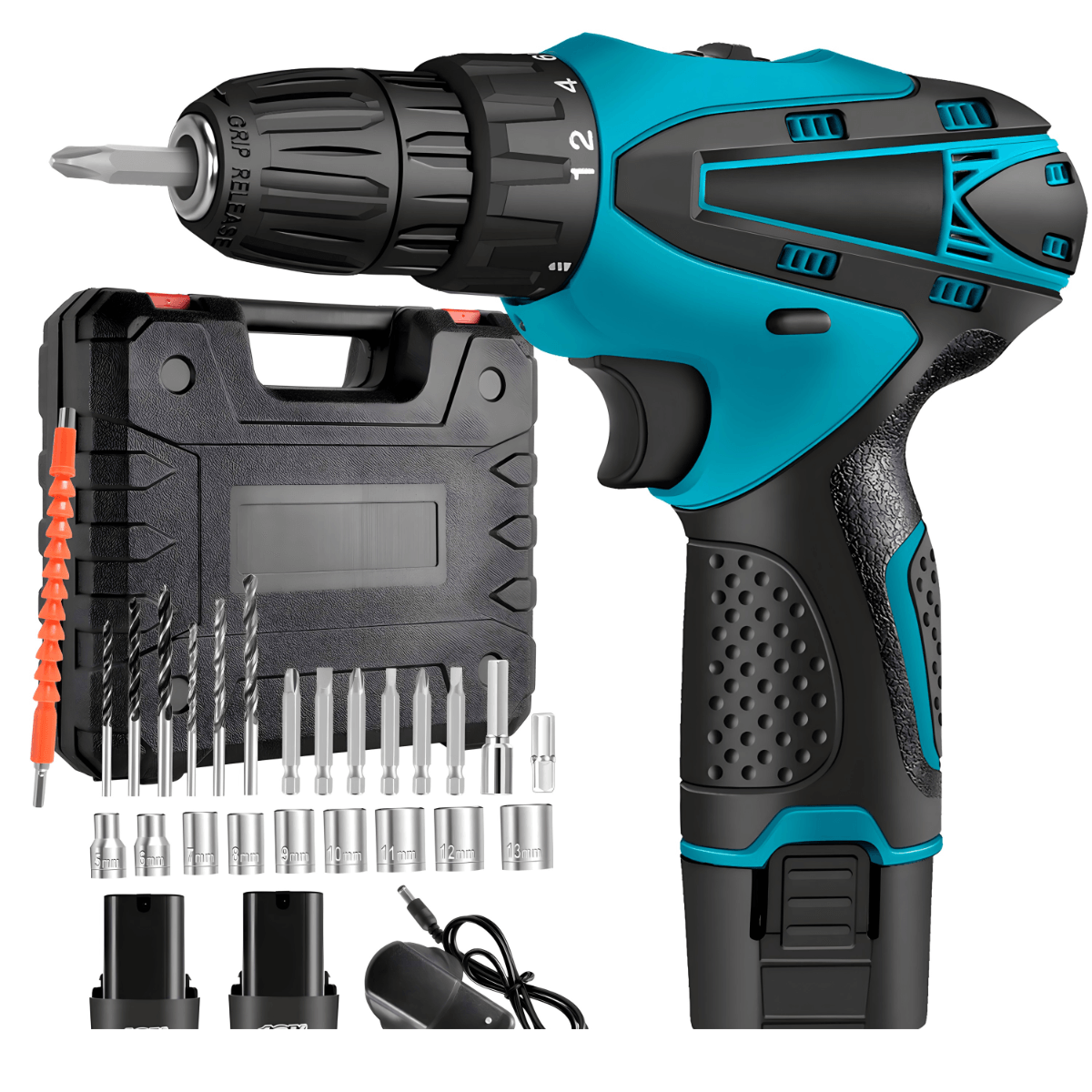 Paket sadrži: 1x Bežična bušilica, 2x Baterija, 1x Punjač, 1x Adapter za punjač, 5x Burgija, 7x Bitova, 10x Nasadnih ključeva, 1x Elastični produžetak, 1x Zaštitna kutija